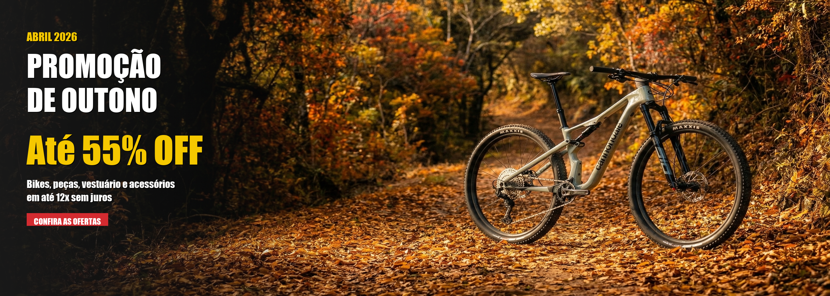 Abril chegou com descontos de até 55% em bikes, peças, vestuário e acessórios, incluindo a Cannondale Scalpel Carbon 3 2025 e a Caloi Explorer Expert SL 2024.